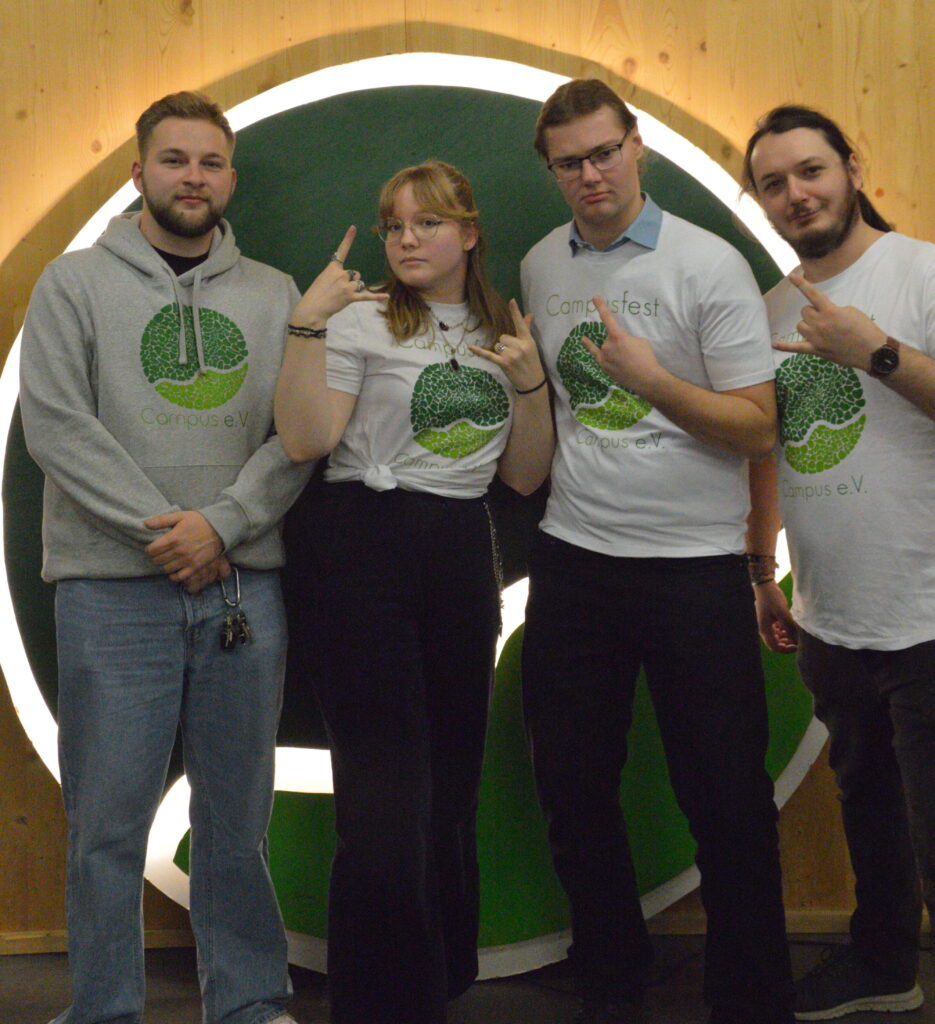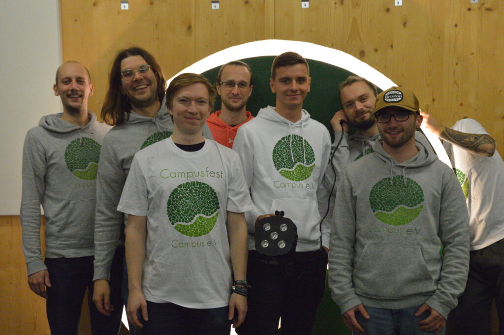 Aber mal im Ernst. Wir sind für eine der drei Musikbühnen zuständig. Und diese Bühne spielt eben die etwas härtere Musik. Da wir noch ein relativ junges Team sind, können wir noch nicht auf eine lange Campus-e.V.-Tradition zurückblicken. Trotzdem wollen wir allen Pommesgabelschwenkern und die Haarhygieneproduktindustrie-Rettenden eine Möglichkeit bieten die Musik auf unserem Fest zu genießen – ohne dass man sich gleich wie bei in einer Liveschaltung zum Supermarkt fühlt.
